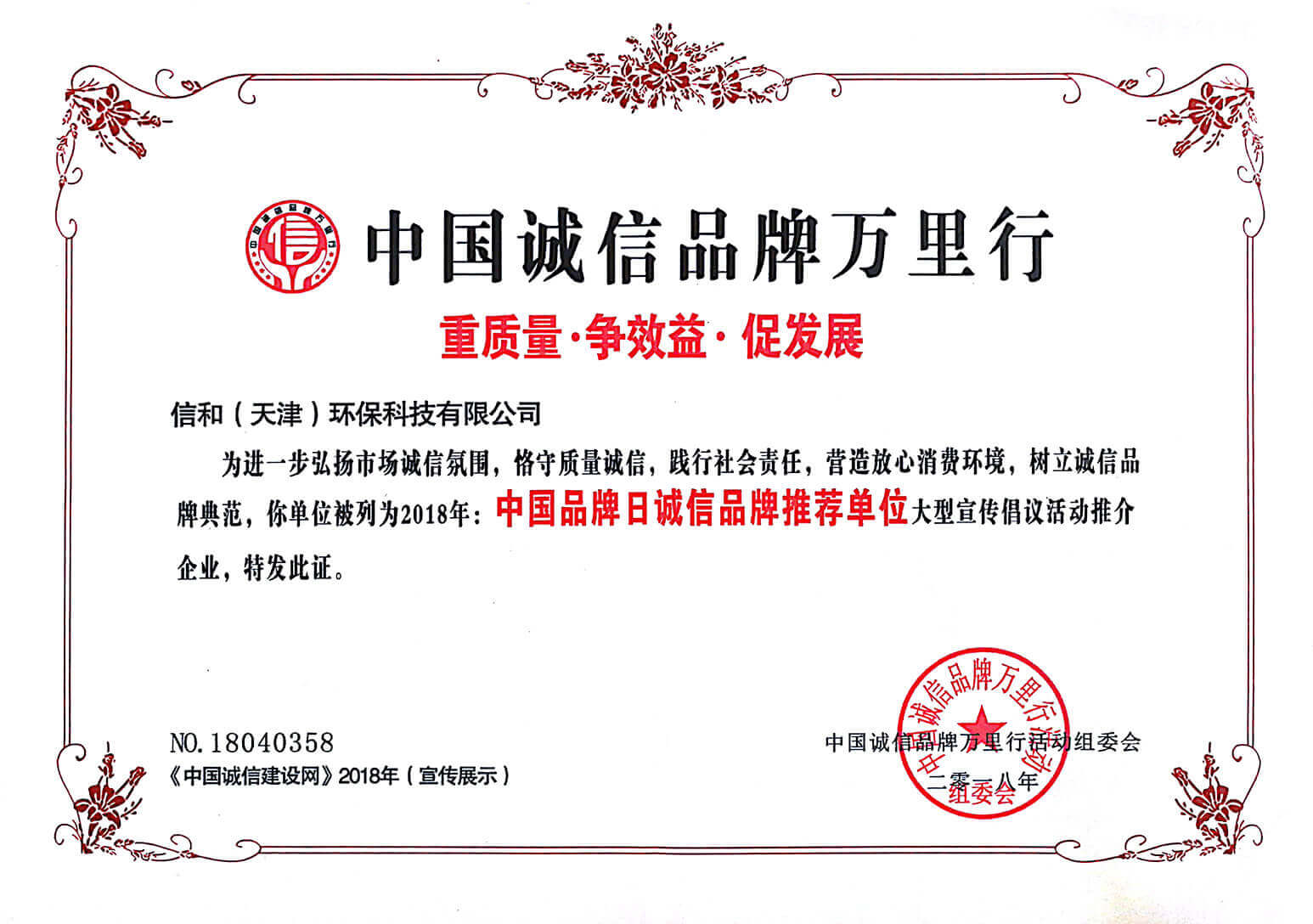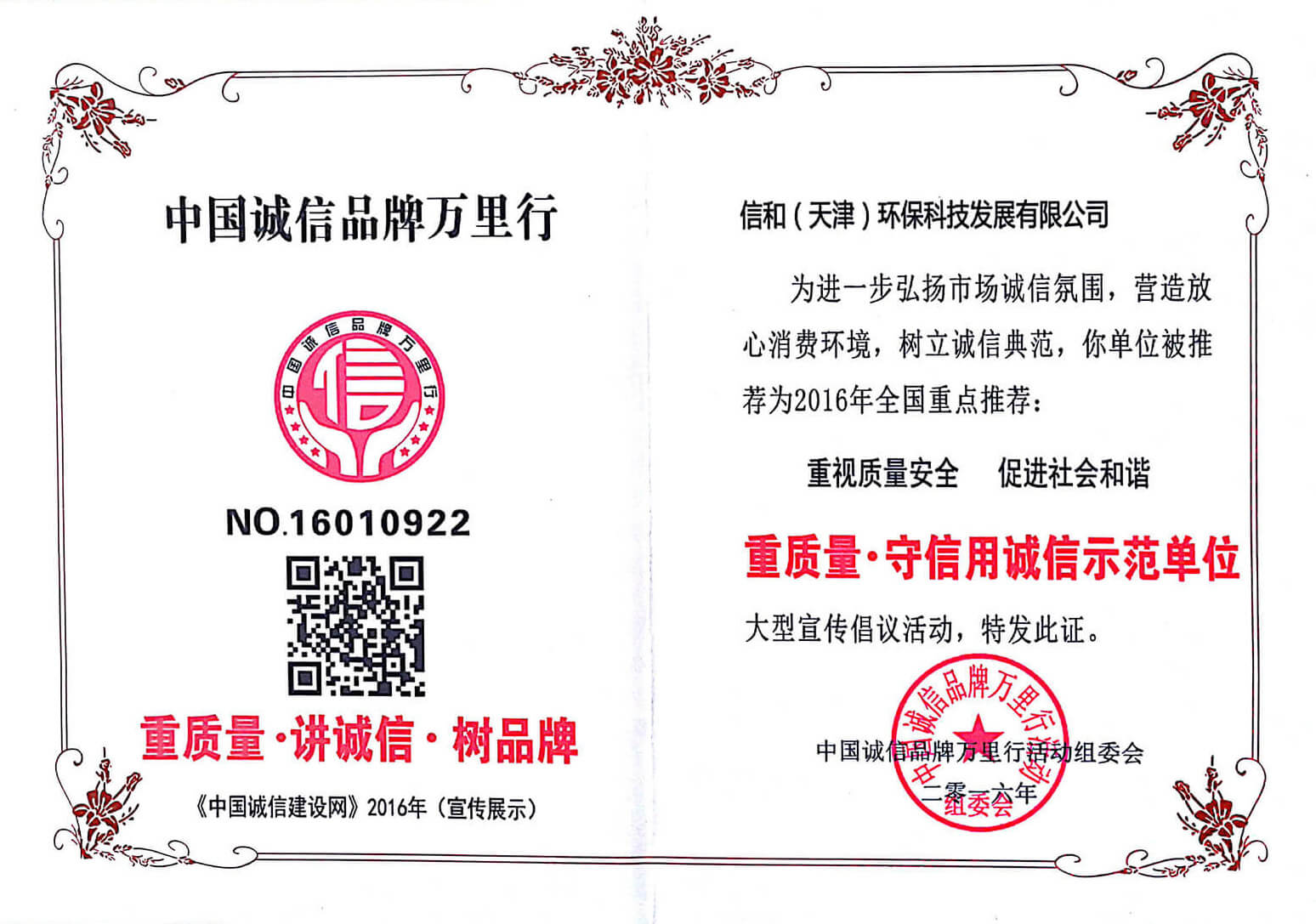 “質(zhì)量就是生命”。信和重質(zhì)量、守信用,被中國(guó)誠(chéng)信品牌萬里行推薦“誠(chéng)信示范單位”、“AAA資信等級(jí)”、“AAA級(jí)誠(chéng)信經(jīng)營(yíng)示范單位”、“誠(chéng)信經(jīng)理人榮譽(yù)證書”、“誠(chéng)信企業(yè)家榮譽(yù)證書”、“中國(guó)產(chǎn)品質(zhì)量放心達(dá)標(biāo)企業(yè)”、“誠(chéng)信品牌聯(lián)盟會(huì)員單位”、“中國(guó)質(zhì)量誠(chéng)信AAA級(jí)品牌企業(yè)”、“中國(guó)百強(qiáng)優(yōu)秀企業(yè)”、“節(jié)能環(huán)保推廣產(chǎn)品”、“全國(guó)科技創(chuàng)新企業(yè)”等榮譽(yù)稱號(hào)。